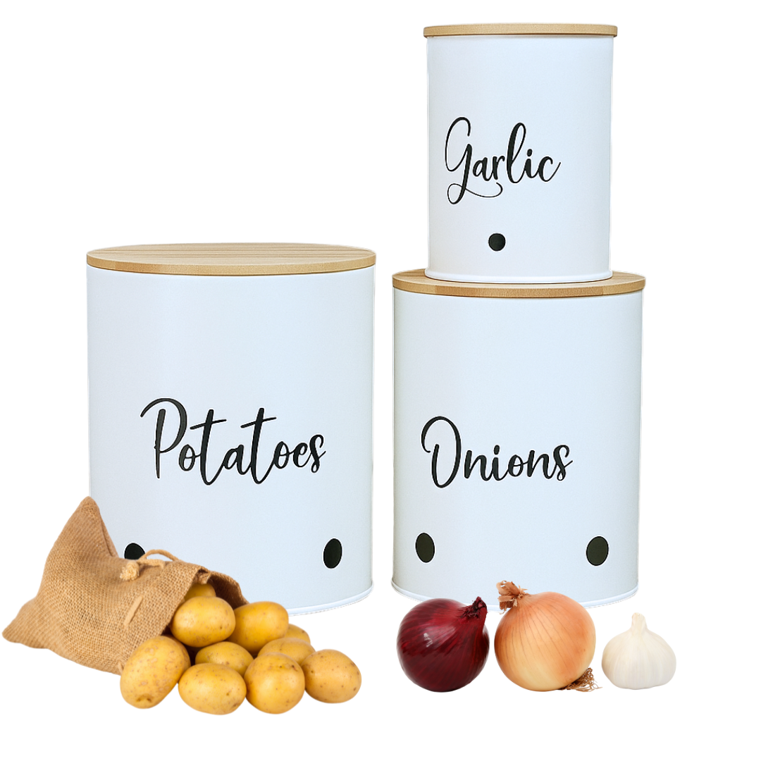 - 🥔 3-Piece Set for Essential Veggies: Includes 3 white round canisters clearly labeled for Potatoes, Onions, and Garlic – a stylish and practical solution for your kitchen or pantry.