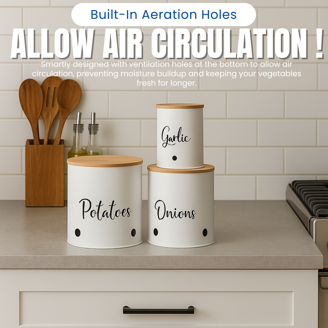 Each canister is thoughtfully designed with aeration holes to enhance airflow, helping keep your vegetables fresh for longer without sprouting or molding. The bamboo lids add a natural, eco-conscious touch while sealing out dust and pests.